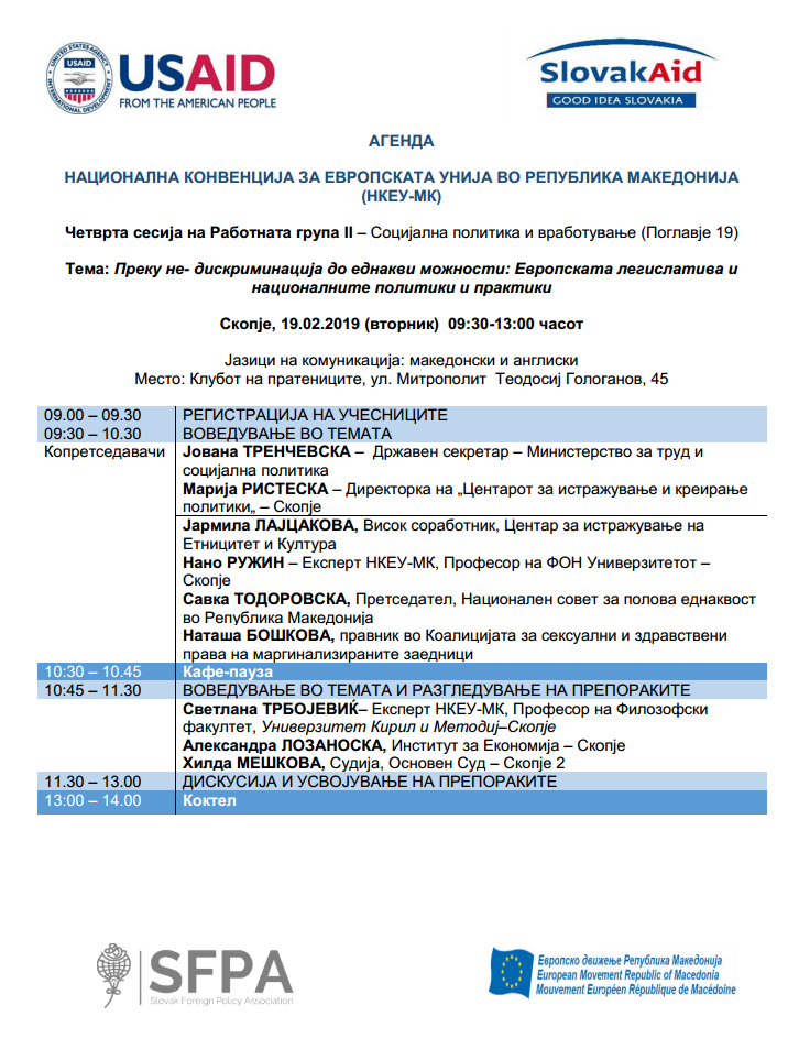 Агенда – Четврта сесија на Работна група 2 (Поглавје 19) – Преку не-дискриминација до еднакви можности: Европската легислатива и националните политики и практики