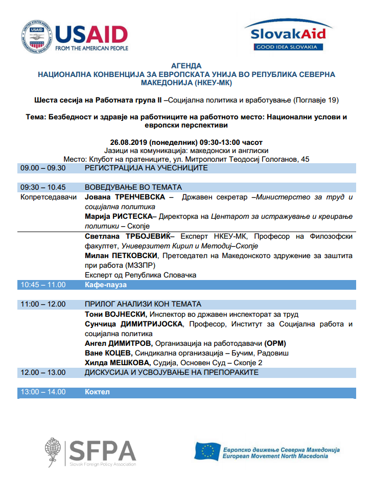 Агенда – Шеста сесија на Работна Група 2 – Социјална политика и вработување (Поглавје 19) – Безбедност и здравје на работниците на работното место : Национални услови и европски перспективи