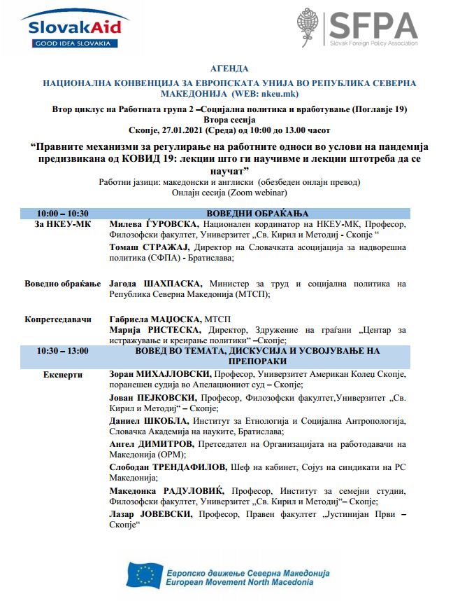 Агенда – Осма сесија на Работна група -2, Социјална политика и вработување (Поглавје 19) – „Правните механизми за регулирање на работните односи во услови на пандемија предизвикана од КОВИД-19: лекции што ги научивме и лекции што треба да се научат“