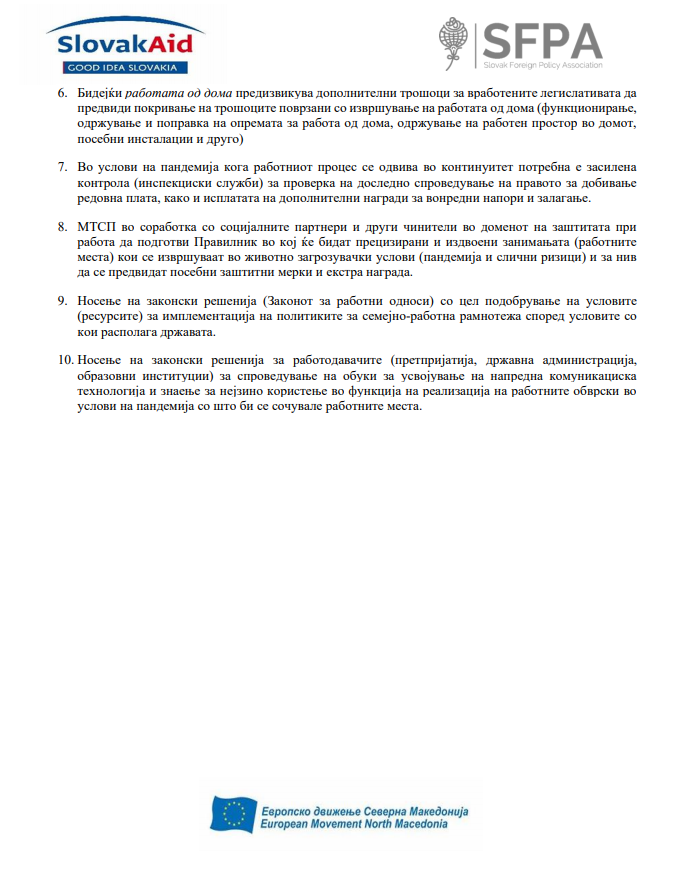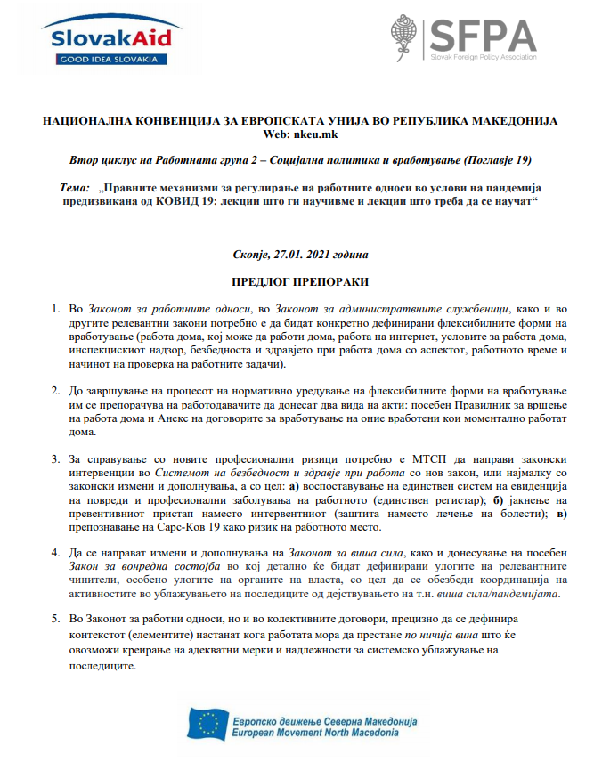 Предлог препораки од осма сесија на Работна група 2 – Социјална политика и вработување (Поглавје 19) – „Правните механизми за регулирање на работните односи во услови на пандемија предизвикана од КОВИД 19: лекции што ги научивме и лекции што треба да се научат“