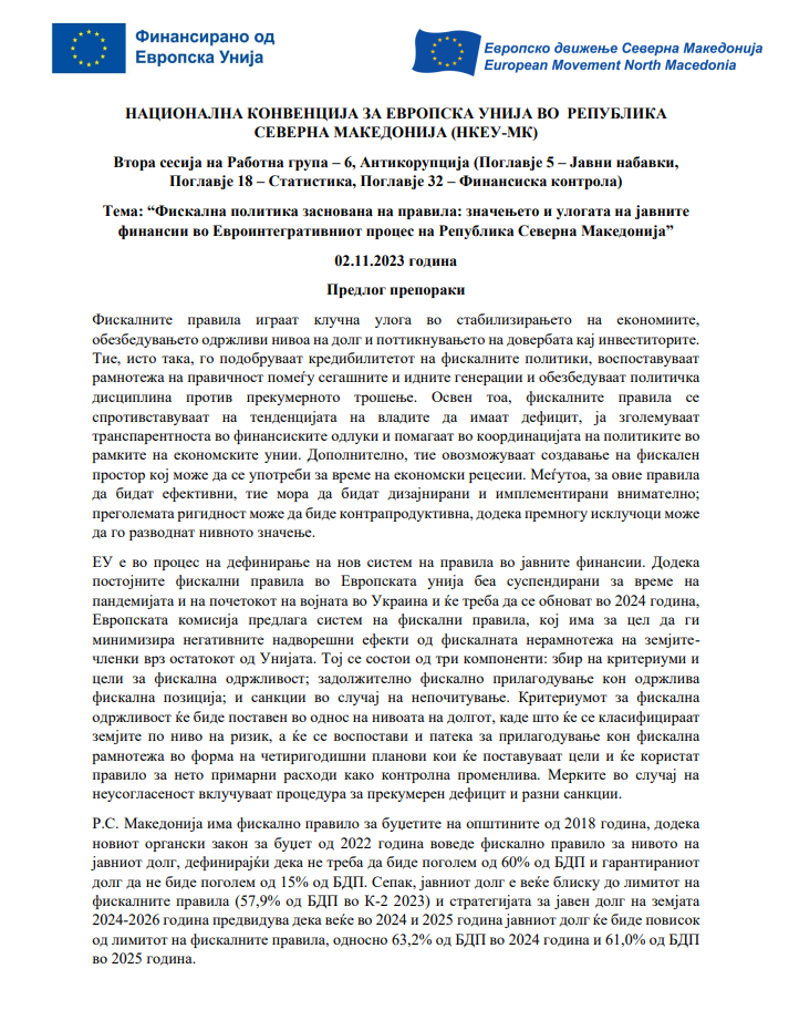 Предлог препораки за втора сесија на Работна група – 6, Антикорупција – “Фискална политика заснована на правила: значењето и улогата на јавните финансии во Евроинтегративниот процес на Република Северна Македонија”