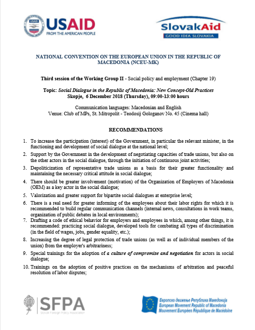Recommendations from the Third session of Working Group 2 – Social Policy and Empoyment (Chapter 19) – “The Social Dialogue in the Republic of Macedonia: Between new concept and old Practices”