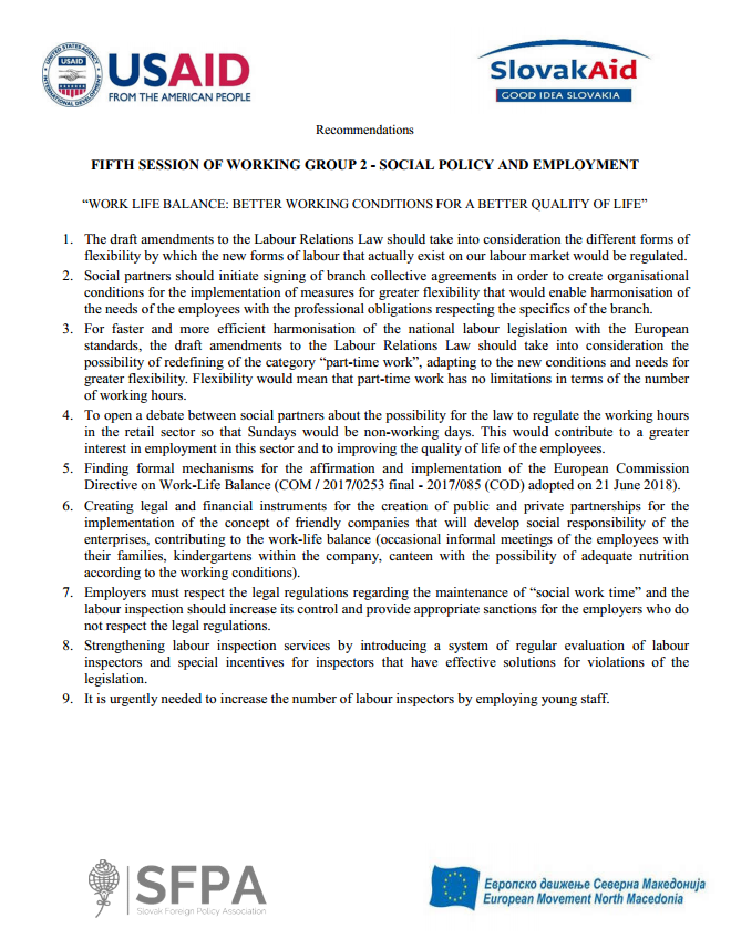 Recommendations from the Fifth session of Working Group 2 – Social Policy and Employment (Chapter 19) – “Work – life balance, better working conditions – better life”