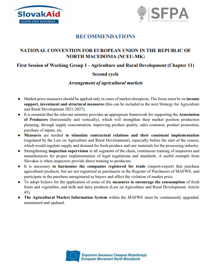 Recommendations from the Seventh session of Working Group 1 – Agriculture and Rural Development (Chapter 11) – “Arrangement of agricultural markets”