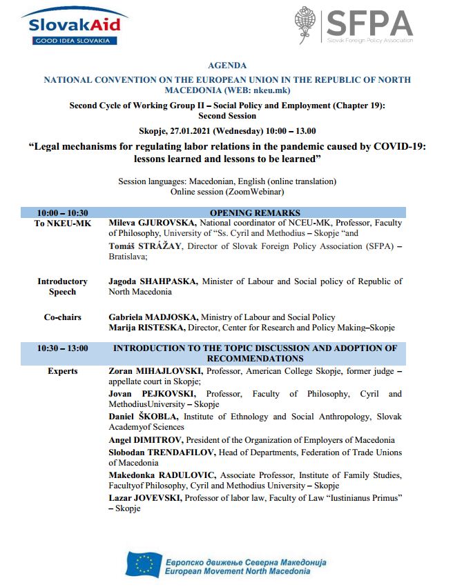 Agenda – Eight session of Working group 2 (Chapter 19) – “Legal mechanisms for regulating labor relations in the pandemic caused by COVID-19: lessons learned and lessons to be learned”