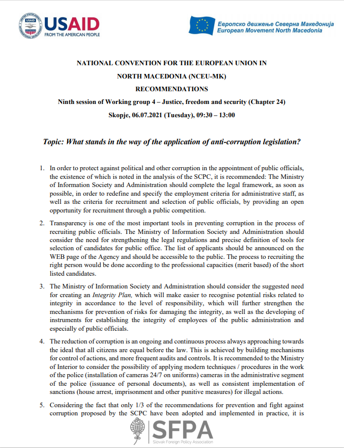Recommendations from Ninth session of Working group 4 – Justice, freedom and security (Chapter 24) – “What is on the way to the application of anti-corruption legislation?”
