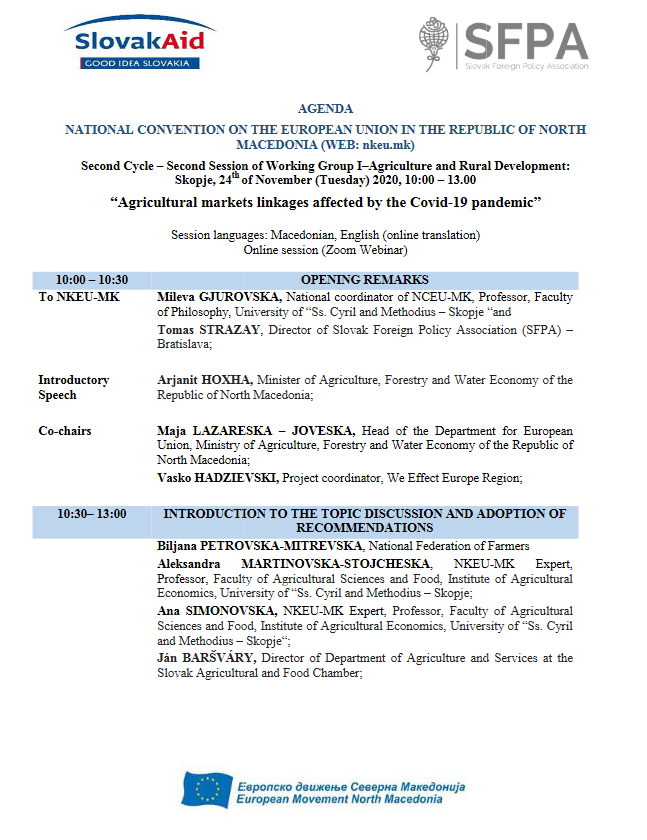 Agenda – Eight session of Working group 1 – Agriculture and rural development (Chapter 11) – “Agricultural markets in the time of the COVID-19 pandemic”